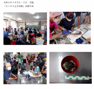 南那珂地域支部より食育ティーチャー活動の報告です。10月4日から5日に、日南市の松浦優美さんが「カツオさばき体験」を開催しました。吾田小学校5年生2クラスを対象に、日南市獲れのカツオを使った郷土料理の「カツオ丼」を作る調理実習を開催しました。自分でさばいたかつおを使ったかつお飯を食べた子供たちは、「うまく捌けてよかった」「もっと魚を捌いてみたい」と嬉しそうに話していました。南那珂地域支部では、今後も食育ティーチャーと連携を図り、食育・地産地消活動を推進してまいります。