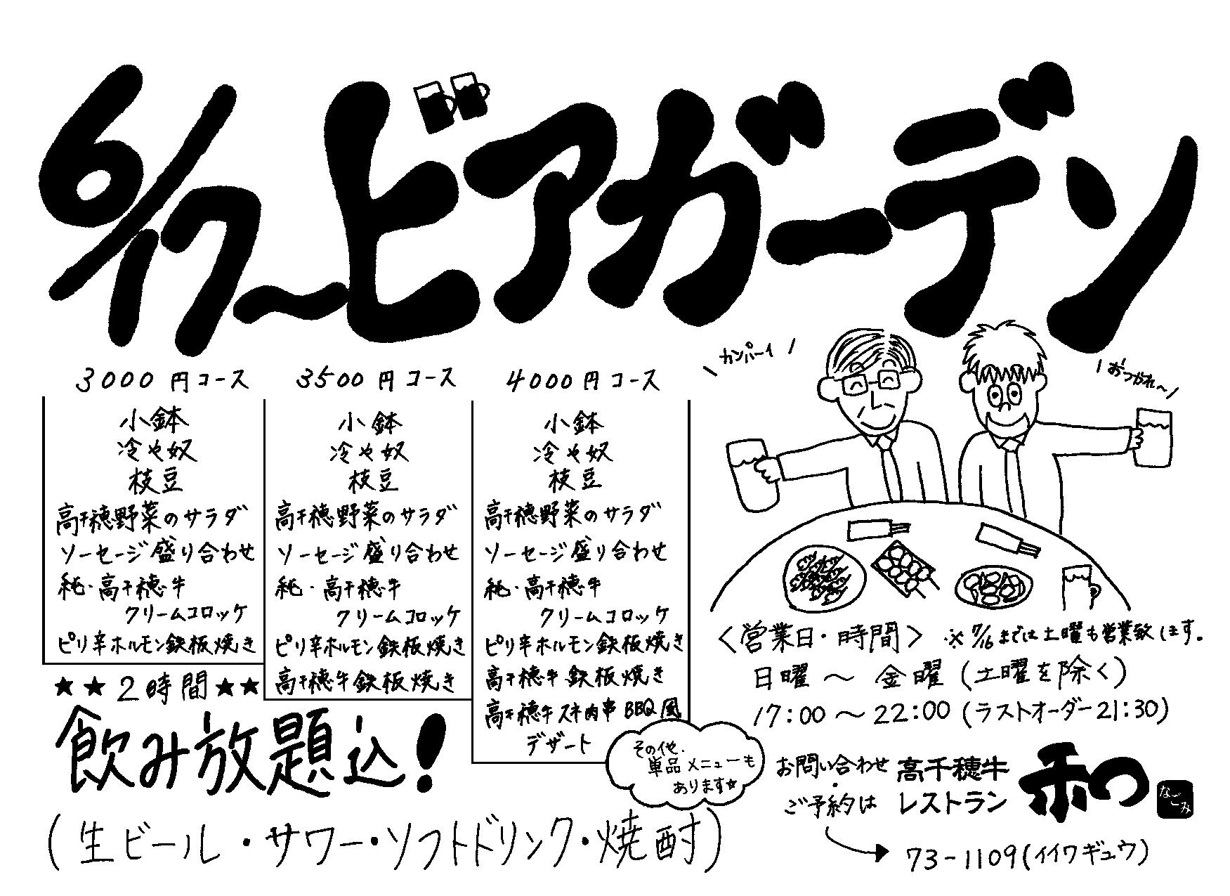 こだわり料理の店「高千穂牛レストラン 和」ではビアガーデンを開催中です。高千穂牛鉄板焼きをはじめ、高千穂野菜のサラダや純・高千穂牛のクリームコロッケなど、高千穂産の食材を使った料理がいっぱい…。高千穂産のおいしい料理で暑い夏を満喫しましょう!!■御予約・お問合せ Tel 0982-73-1109