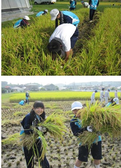さる8月9日(火)、高鍋東中学校3年生115名が稲刈り体験を行いました。前日まで、天候不順でしたが、この日は天候にも恵まれ、順調に実施できました。稲刈りは、鎌による手刈りで実施し、その後コンバインで脱穀を行いました。稲刈りした稲の品種は、『峰の雪もち』という餅米の品種で、今後は11月にこのお米を使って餅つきをする予定です。