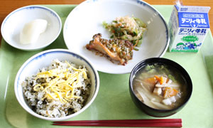 苦みのある“くさぎな(草木菜)”を食べやすく調理した、伝統食材を活かした献立です。また、豆腐と白玉で作った“だご”汁は、つるん!もちもちとした食感が楽しめます。
