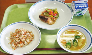 ご飯には、にんじん、千切り大根、ちりめんじゃこ、魚のカラフル南蛮には、赤、黄ピ-マン、きゅうり、ゴーヤ、魚を使っています。